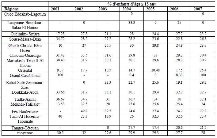 Les résultats de la répartition des enfants d’âge inférieur ou égale à 15 ans selon les régions et l’année sont représentés par le tableau XXV.