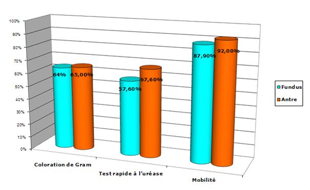 On remarque également que le taux de positivité le plus élevé concerne l’étude de la mobilité (90%). Ce taux peut s’expliquer par la présence de bactéries contaminantes mobiles provenant de la flore oro-pharyngée des patients ou des contaminations du matériel d’endoscopie qui peuvent souiller la lame et induire de faux positifs.