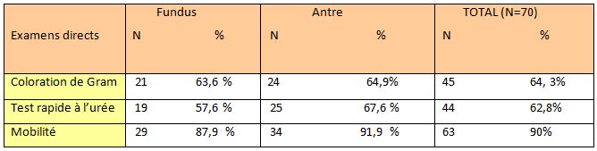 Tableau XI : Positivité aux examens directs (N=70)