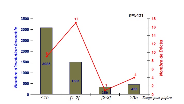 Cependant, le calcul de la létalité spécifique en fonction du temps post-piqûre donne des taux respectifs de 2.9‰, 11.19‰, 2.7‰ et 8.71‰ pour les classes de TPP <1, entre 1 et 2h, entre 2 et 3h et ≥ 3 heures. On peut donc dire que le maximum de létalité est observé pour les patients qui arrivent tard aux structures sanitaires.