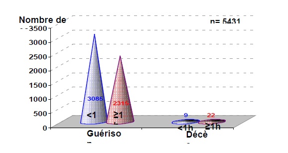 L’évolution en fonction du TPP selon les 2 groupes montre que les décès sont faibles chez les patients qui arrivent à la structure sanitaire dans un délai inférieur à 1 heure (0.29%), par contre, ils sont importants si le TPP est supérieur ou égale à 1 heure (0.94%).