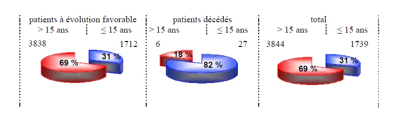 Les décès concernent principalement (82%) les enfants d’âge ≤ 15 ans. Le pourcentage de décès est de 1.55% chez les enfants et de 0.15% chez les adultes d’âge > 15 ans.