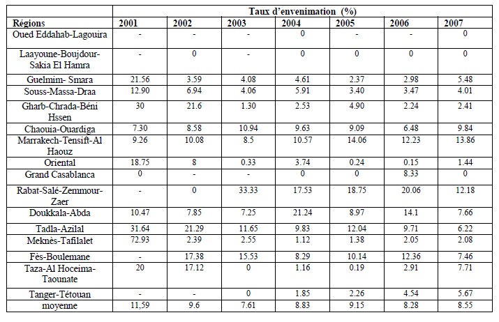 Le taux d’envenimation moyen est de 14,6% à Tadla-Azilal, de 11,2% à Marrakech-Tensift-Al Haouz, 11% à Doukkala-Abda et 9% à Chaouia-Ouardiga. Par contre, il est faible à nul au niveau des régions du nord (Taza-Al Hoceima-Taounate, Tanger-Tétouan), de l’oriental et du sud (Oued Eddahab-Lagouira, Laayoune-Boujdour-Sakia El Hamra).