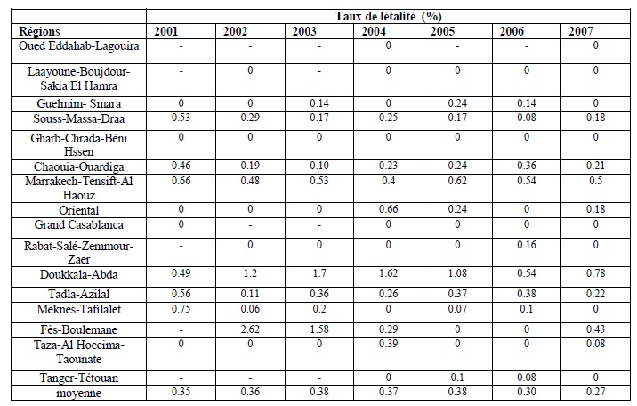 Le taux de létalité est très important à Doukkala-Abda, Marrakech-Tensift-Al Haouz, Tadla-Azilal et Chaouia-Ouardiga par ordre décroissant. Par contre, il est nul au niveau Oued Eddahab-Lagouira, Laayoune-Boujdour-Sakia El Hamra, Gharb-Chrada-Béni Hssen et le Grand Casablanca.