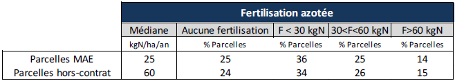 L’étude révèle que la fertilisation azotée présente une valeur médiane de 60 kgN/ha/an sur les parcelles « hors contrat » contre 25 kgN/ha/an pour les prairies MAE, soit une valeur plus de deux fois plus élevée. De manière générale, les pratiques de fertilisation sont raisonnées et correspondent aux objectifs de conservation sur la zone Natura 2000, avec ou sans MAE.