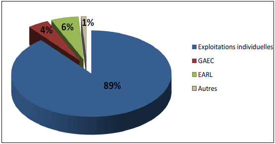 La grande majorité des exploitations dispose du statut d’exploitation individuelle. La part de Groupements Agricoles d’Exploitation en Commun (GAEC) et d’Exploitations Agricoles à Responsabilité Limitée (EARL) est très réduite.