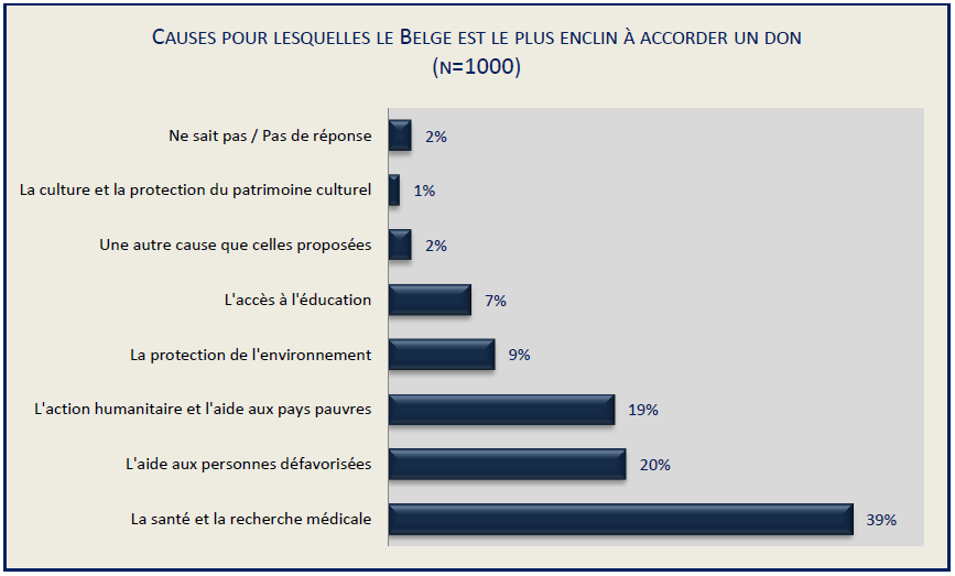 Les Belges sont plutôt sensibilisés par les projets liés à la recherche médicale et, dans une moindre mesure, par des organisations actives dans les domaines de l’aide aux personnes défavorisées et de l’action humanitaire dans les pays pauvres. Ils accordent tout autant d’importance aux causes défendues par les organisations qui les sollicitent, qu’aux résultats obtenus par ces dernières sur le terrain. Ils préfèrent majoritairement soutenir des organisations qui agissent sur le long terme ; cependant, ils restent nombreux à privilégier le soutien en réaction à des catastrophes.