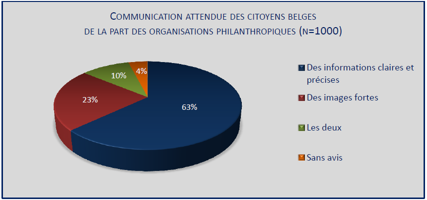 La majorité des Belges attend des informations claires et précises de la part des organisations ; un peu plus d’un belge sur cinq réclame des images fortes ; et un belge sur dix souhaite une communication qui combine les deux types précédents. Ceux qui sont demandeurs d’informations claires et précises sont majoritairement des donateurs, relativement âgés ; ceux qui attendent des images fortes sont principalement des non-donateurs, relativement jeunes.