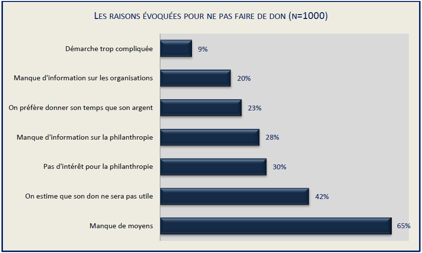 Ceux qui ne donnent pas l’expliquent principalement par le manque de moyens dont ils disposent ; ils évoquent aussi le manque d’information, le manque d’intérêt et la perception que leur don ne sera pas utile.