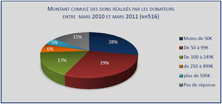 Comme on peut le voir sur la Figure III-23, La majeure partie des donateurs interrogés a, entre mars 2010 et mars 2011, donné moins de 99€ sur une année ; presqu’un donateur sur cinq a donné entre 100 et 249€ ; et un peu plus d’un donateur sur dix a donné plus de 250€. Notons, à nouveau, que le don moyen annuel par ménage donateur était exceptionnellement élevé pour l’année 2010 étant donné la catastrophe qui a pris place en Haïti(22). De ce fait, il est possible que les résultats obtenus sur ce pie chart soient biaisés par cet évènement et qu’ils ne reflètent pas le comportement usuel – hors situation de crise – des donateurs belges.