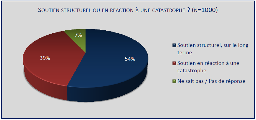 On constate, à travers la Figure III-27, que la majorité des Belges – 54% d’entre eux –, préfère donner dans le cadre d’un soutien structurel, sur le long terme plutôt qu’en réaction à une catastrophe ; 39% des interrogés déclarent par contre qu’ils sont plus enclins à donner lors d’une catastrophe.