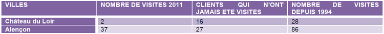 Certains clients n’ont jamais été visités. Une ville comme Château du Loir compte peu de commerces, tous auraient dû être vus au moins une fois. A Alençon, certains ont été suivis six fois dans l’année. Normalement, tous nos clients (3000) doivent avoir été visités une fois dans l’année. Ce tableau prouve que le suivi est irrégulier et inégal.