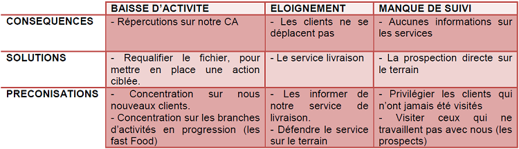 Afin de trouver des solutions adaptées, des analyses de nos points faibles doivent être approfondis. Il conviendra d’apporter des précisions sur les CA des communes de notre zone de chalandise et sur le suivi de la clientèle.