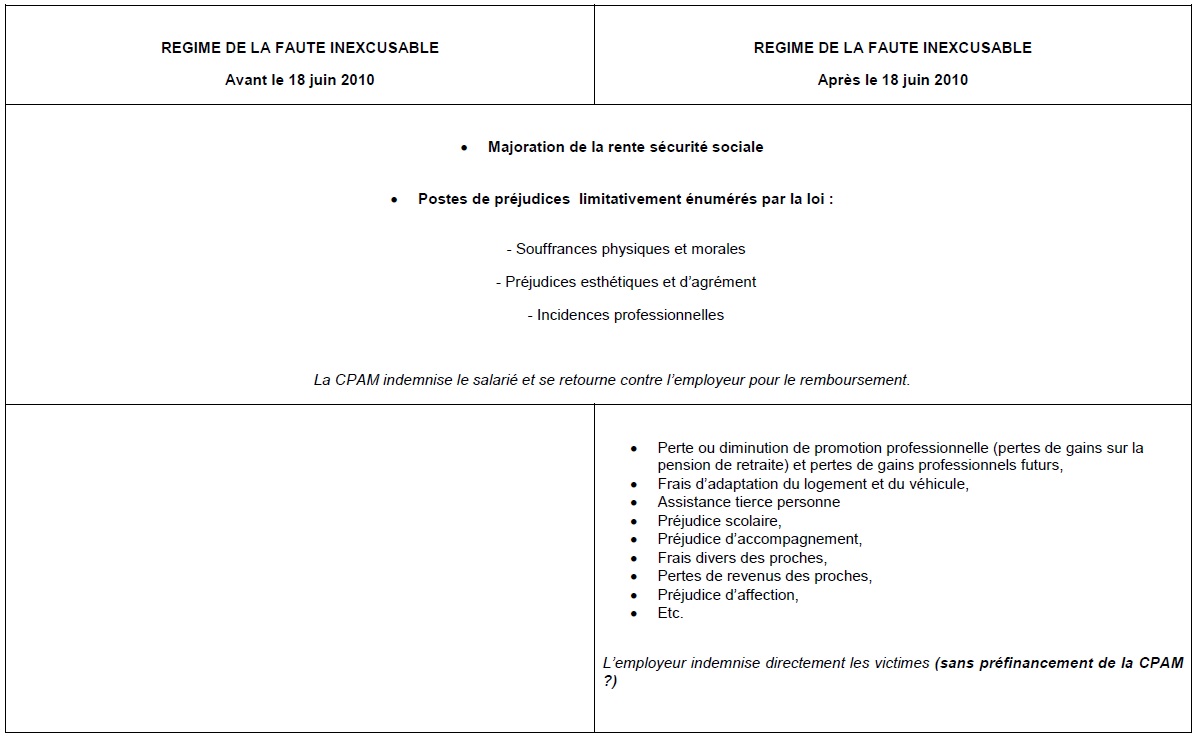 Tableau comparatif des postes de préjudices réparés en cas de faute inexcusable avant et après le 18 juin 2010