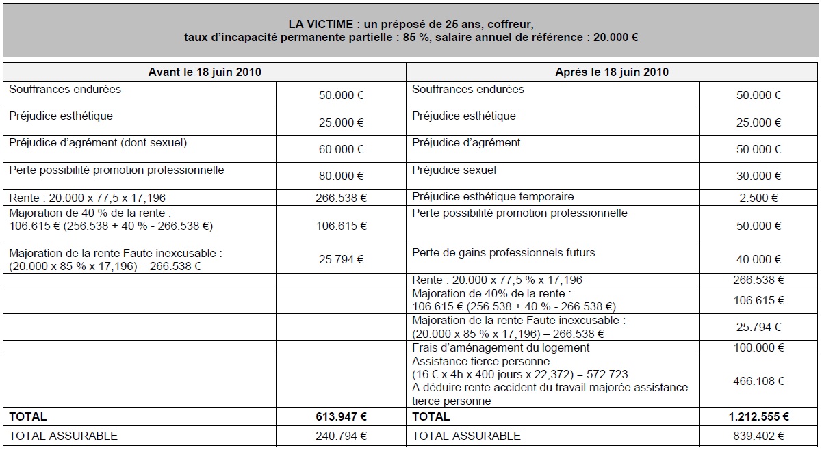 Tableau comparatif des préjudices indemnisables avant et après le 18 juin 2010 pour un même cas de faute inexcusable (Source : SMABTP)