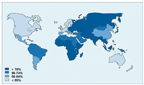 Figure n°2 : Prévalence de l’infection à Helicobacter pylori dans le monde*