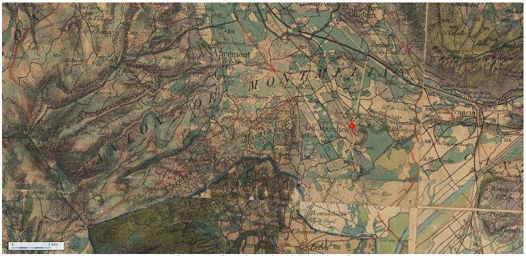 Extrait de la carte de Cassini, site internet géoportail, le point rouge est à l’emplacement du village des Marches