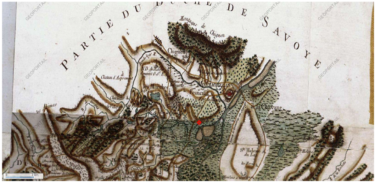 A l’échelle qui nous intéresse la carte de Cassini (royaume de France) est assez peu précise (figure 33), elle dessine juste la cluse de Chambéry. On peut cependant y repérer les points importants du paysage des Abîmes, mais leurs emplacements sont assez aléatoires. Par exemple le hameau de Chacusard est placé à l’ouest d’Apremont alors qu’il se trouve en réalité à l’est.