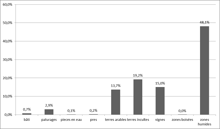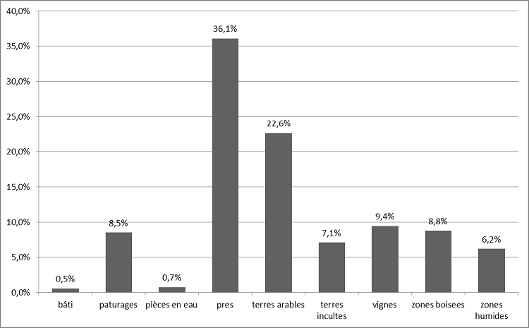 Ont été retenues neuf catégories : bâti, pièces en eau, zones humides, terres incultes, pâturages, terres arables, prés, vignes, et zones boisées. L’ensemble des parcelles des trois mappes étudiées ont été réparties selon ce nouveau classement.