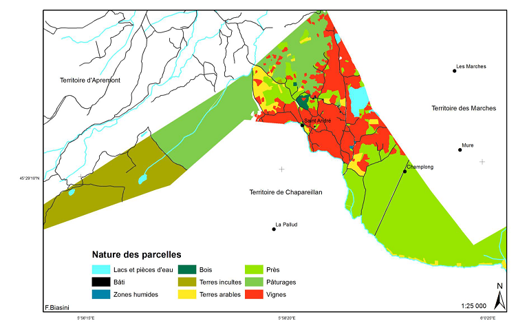 Mais cela signifie aussi que, malgré la grande organisation de cette entreprise, les autorités n’ont pas été jusqu’à prédéterminer des catégories de nature de sol et ce, même si la « charte graphique » semble aller dans ce sens. C’est une chance pour le chercheur qui peut obtenir une information très précise et sans doute assez fiable. Ainsi il est indiqué que sur la commune d’Apremont se trouve non pas une forêt, mais un bois de châtaigniers et de sapins. Cette précision peut permettre d’imaginer différentes pratiques : récolte de châtaignes, exploitation du sapin pour la construction…. Il faut noter que la mappe des Marches de 1730 ne signale pas de lacs ou de pièces d’eau, fait surprenant puisque l’extrémité du lac de Saint-André se trouve pourtant sur ce territoire.