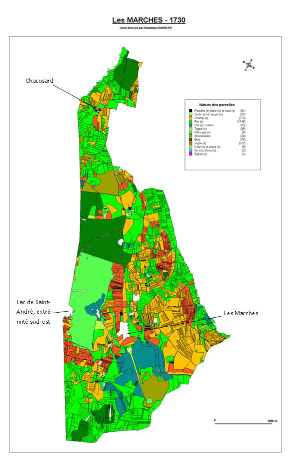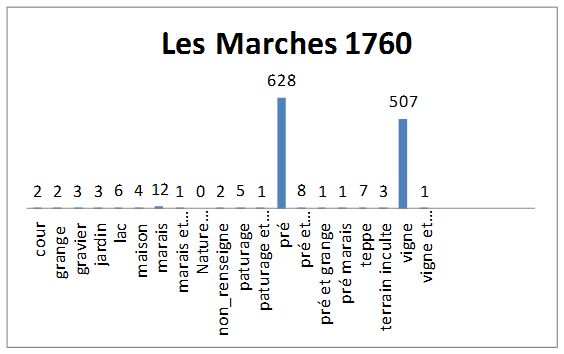 La mappe sarde des Marches pour le territoire de 1730 totalise trois mille cinquante-six parcelles réparties en cinquante-deux catégories : Blachère, Bois, Bois et broussailles, Bois et taillis, Broussailles, Champ, Château, Cour, Couvent et église, Eau morte, Eglise et cimetière, Fossé rempli d’eau, Four, Grange, Grange et masure, Grange et place, Grange et placéage, Grange et ruine, Jardin, Jardin et masure, Le molard de l’église des marches, Les communaux, Maison, Maison et cour, Maison et grange, Maison et jardin, Maison et place, Maison et placéage, Maison, cour et grange, Maison, cour et jardin, Maison, four et pré, Maison, grange et cour, Maison, place et jardin, Maison, pré et four, Masure, Masure et place, Masure et placéage, Pâturage, Placéage, Pré, Pré et blachère, Pré et broussailles, Pré et four, Pré et grange, Pré et marais, Pré et verger, Pré marais, Sol et place de la chapelle, Teppe, Teppe et broussailles, Teppe et pâturage, Vigne