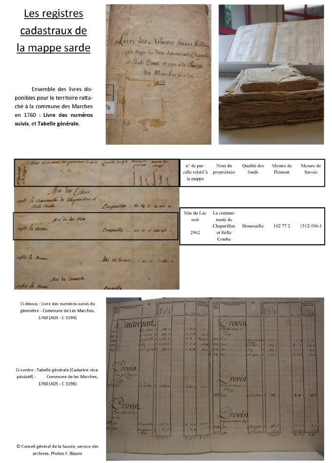 Le premier document de travail a été le Livre des numéros suivis ( ADS – C 3194). Il s’agit d’un gros volume d’une centaine de feuillets titré : «Livre des Numéros suivis relatty a la Mappe des Terres Demambrées de Chaparillian et Belle Combe et unies à la Paroysse des Marches fait en l’anné 1761 ». Les feuilles présentent un tableau de cinq colonnes et de six à huit lignes dans lesquelles sont reportées pour chaque parcelle : son numéro relatif à la mappe, les noms et surnoms des possesseurs de fonds ainsi que leur ascendance, leur présence ou absence au moment de la visite du géomètre, la «qualité des fonds » (c’est à dire la nature de la parcelle), et enfin la surface en mesure de Piémont et de Savoye ( qui se divisent chacune en unités : journaux, tables, pieds). L’ordre adopté par le géomètre est celui des parcelles qui commence au numéro 2961 pour s’achever au 4224.
