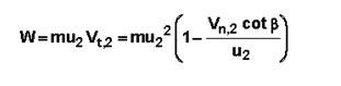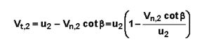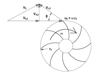 Le diagramme montre également la composante normale de la vitesse de fluide, Vn,2 à la sortie de la roue. Le débit volumique de l’impulseur est proportionnel à la composante normale de la vitesse. A partir du diagramme de vitesse, la composante tangentielle Vt,2 peut être écrite en fonction de U2 vitesse de pointe, de la composante normale Vn,2 et de l’angle de sortie par rapport aux aubages β: