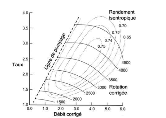 Le débit de blocage est parfois utilisé au dénominateur de cette expression. On notera que la plage d’un compresseur diminue quand le taux de compression augmente. Les phénomènes liés au pompage sont le sujet d’études à part entière, nous les aborderons dans la troisième partie de ce mémoire.