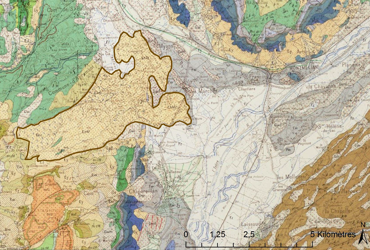 Figure 12 : Carte géologique au 1:50 000 de Montméliant. L’éboulement de 1248 est souligné par un trait marron. Barféty, J.-C., & Gidon, M., 1969.