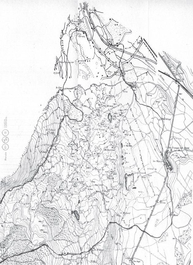 Figure 10 : Les Abîmes de Myans, d’après le plan directeur à 1 : 20 000, complété au nord par un dessin de l’auteur. Le gros trait noir, malheureusement un peu faible vers le nord, indique la limite atteinte par l’éboulement. Guillaumin, 1937