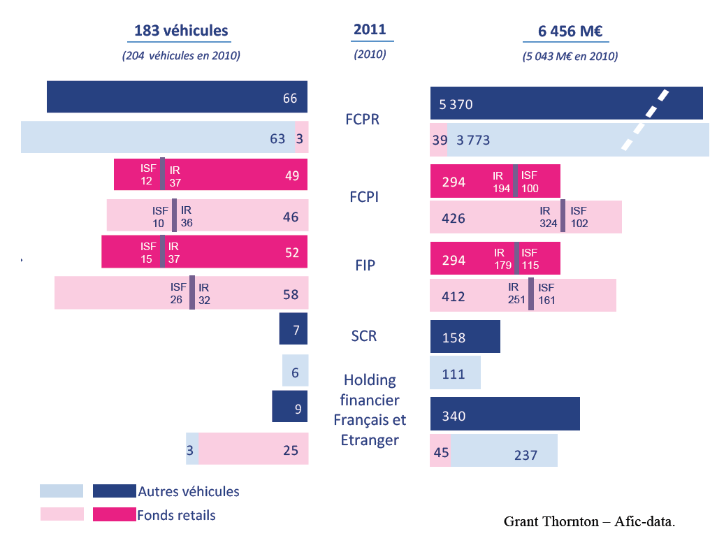 Ce constat démontre non seulement un certain éclatement dans l’utilisation des formes juridiques, mais également une réaffirmation de la prépondérance des FCPR dans le paysage des véhicules d’investissement, brisant ainsi la dynamique initiée par les véhicules spécifiquement dédiés au capital-risque durant l’ère ante-crise (FCPI/FIP). La part des investissements réalisés par des véhicules spécialement dédiés au capital-risque diminue donc progressivement.