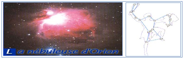 Fig. 43 : La nébuleuse d’Orion et sa schématisation (à droite)