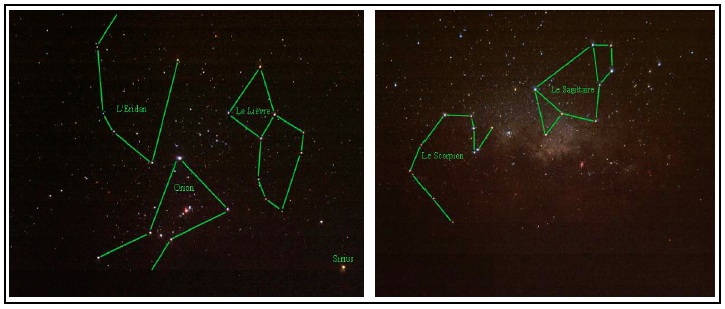 Fig. 44: à gauche, l’Horizon Est avec le Lever d’Orion et à droite, l’Horizon Ouest avec le coucher du scorpion.
