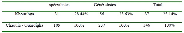 La répartition des médecins par spécialité (2005) présentée ci-dessous (tableau V) montre que les généralistes constituent 64.36% des médecins de la délégation.