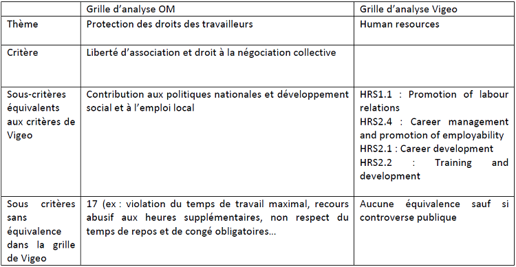 Il faut ajouter à cette liste le fait que des critères de Vigeo correspondent certaines fois à des sous-critères de la grille de Maurel. Par exemple, le critère liberté d’association et droit à la négociation collective de Vigeo correspond en réalité à la contribution aux progrès de la liberté syndicale en tant que sous-critère de la liste d’Olivier Maurel. Or, le critère de Maurel (qui s’appelle aussi liberté d’association et droit à la négociation collective) regroupe douze autres sous-critères qui n’existent pas dans la grille de Vigeo.