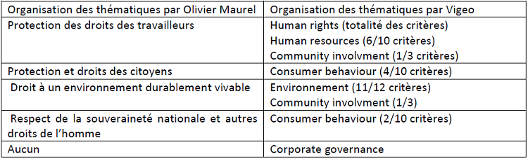 Les thèmes sont organisés différemment en fonction des grilles d’analyse. Seul le thème de l’environnement est traité quasiment de la même manière puisque onze des douze critères de la grille de Vigeo se retrouvent dans celle décrite par Olivier Maurel.