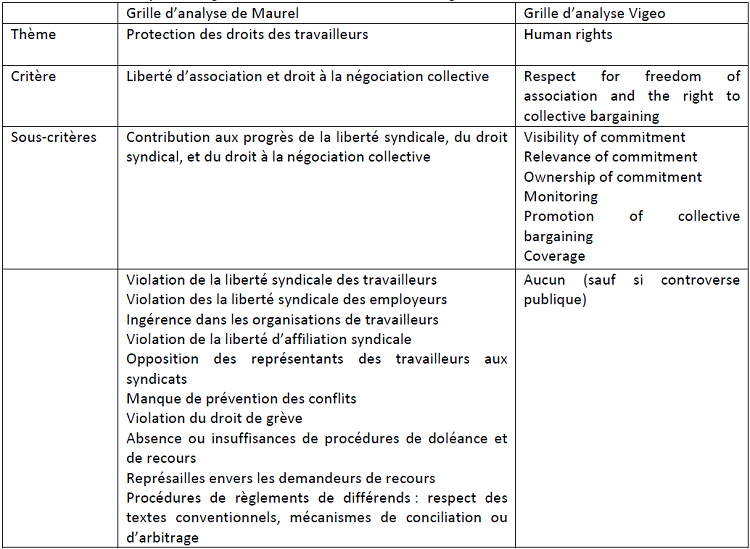 Nous constatons premièrement que le titre « respect for freedom of association and the right to collective bargaining » est similaire au titre de la grille de Maurel « liberté d’association et droit à la négocation collective ».