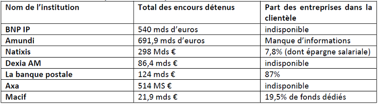 Pour conclure, dans les limites des informations disponibles, nous pouvons remarquer que le différentiel entre les actifs globaux gérés par les sociétés de gestion citées et les entreprises détenant des titres est grand. De surcroît, ces entreprises peuvent gérer leurs fonds en direct ou les confier à plusieurs sociétés de gestion.