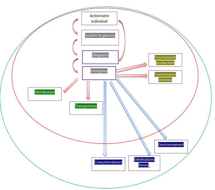 Si nous considérons que l’entreprise a une responsabilité sociétale qui se situe au-delà de la conformité à des législations nationales et qui s’applique à sa sphère d’influence, Il faut considérer la répartition de la responsabilité des parties prenantes internes ou externes de l’entreprise.