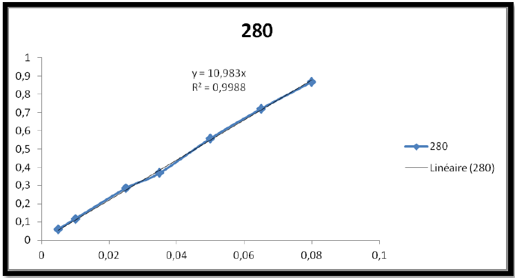 Une courbe standard a été préparée à partir d’une série de solutions de tanin de marc de raisin de concentrations connues à l’aide d’un Varian 2550 UV-vis de numérisation spectrophotomètre (Figure 9). Cette méthode a été étendue afin de déterminer la teneur en matière polyphénolique des tanins extraits obéissant à la loi de Beer-Lambert. Dans une cuve en quartz de 1 cm de largueur, on introduit environ 1 ml de la solution de tanin à analyser (0,5 mg d’extrait de tanin brute dilué dans 10 ml d’eau distillée), après quelques minutes l’absorbance est lue à une longueur d’onde à 280 nm au spectrophotomètre UV-visible 2550.
