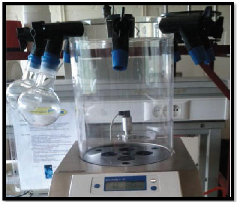 – 1°/ la fraction liquide a été congelée à l’azote liquide et lyophilisée (l’eau est sublimée à basse température et très basse pression) à l’aide du lyophilisateur présenté sur la figure 6; une poudre de tanins a donc été obtenue, plus facile à utiliser pour les analyses et conservable sans variation des propriétés.