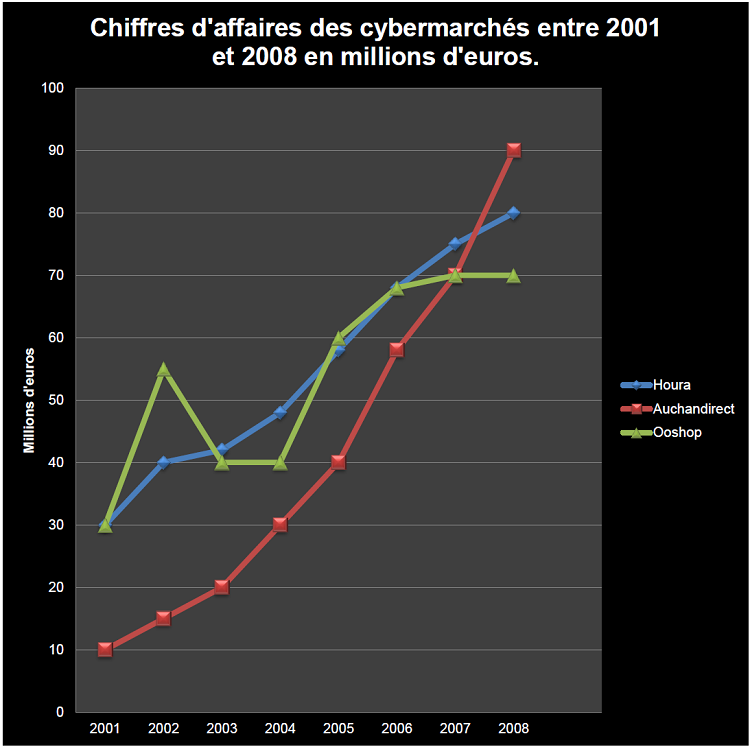 Sur le deuxième graphique, on constate que le chiffre d’affaires des trois plus importants cybermarchés est en perpétuelle augmentation.