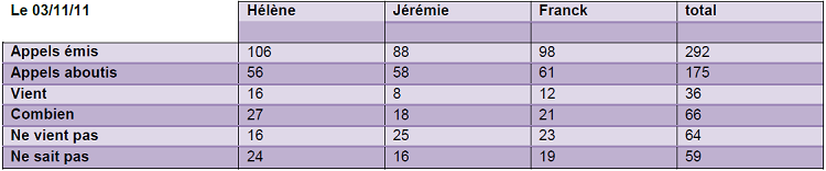 Voici le tableau de reporting que j’ai mis en place. Tous les soirs nous en remettions un exemplaire au directeur. A la fin de chaque journée, nous reportions sur un tableur Excel (ci-joint) (qui comprenait la liste de tous les clients à appeler par rayon) les réponses des clients à l’invitation.