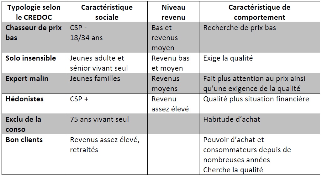 Voici un tableau récapitulatif de ces typologies définies par l’étude du CREDOC :