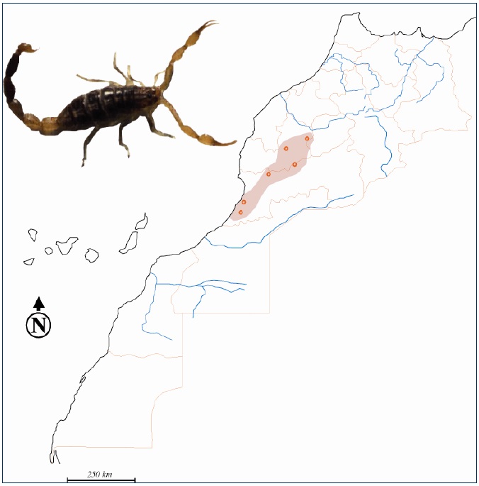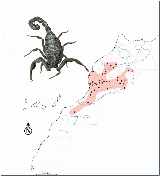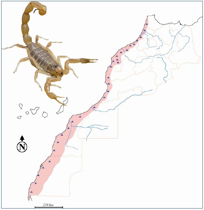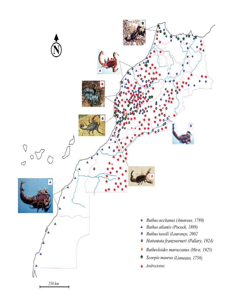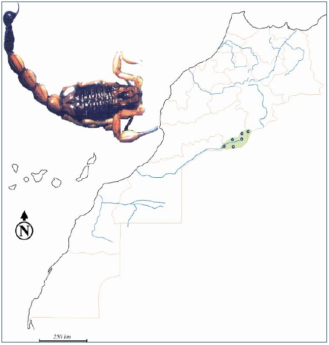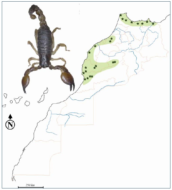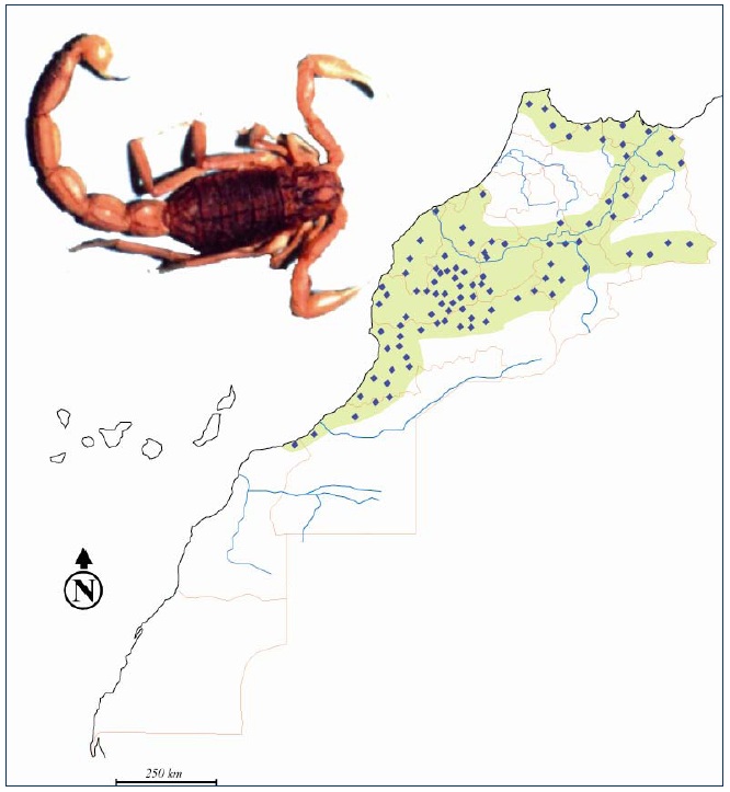 Etant donné sa situation géographique et son climat très diversifié : carrefour des influences méditerranéennes, atlantiques et sahariennes, le Maroc est connu pour sa biodiversité scorpionique dont, seules quelques espèces sont représentées (fig. 30 à 36).