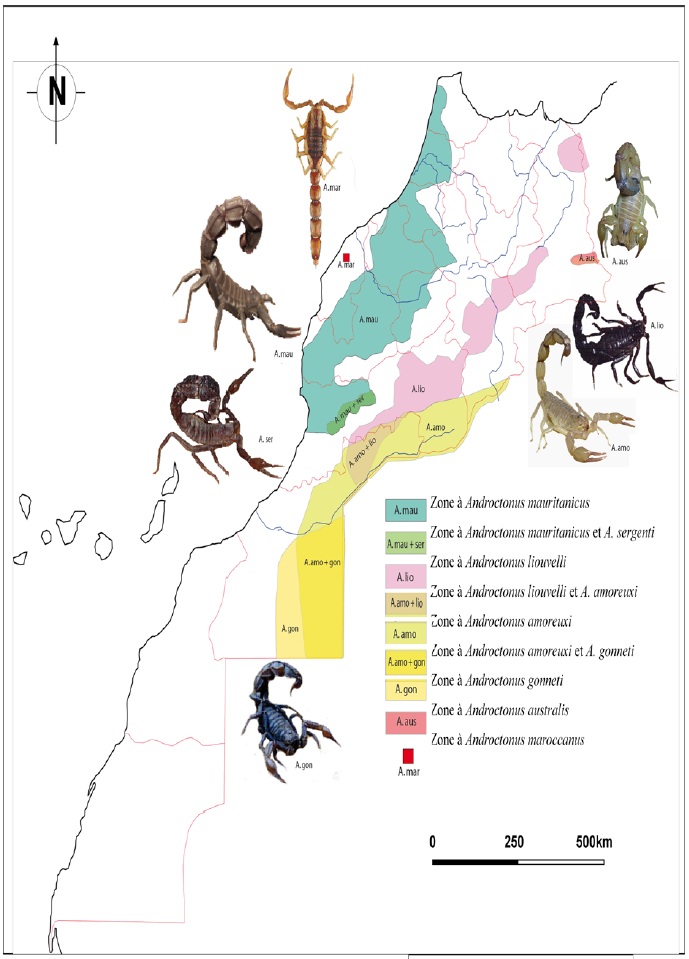 Androctonus amoreuxi (fig. 17) est présents au Centre- Sud du Maroc, au niveau des frontières algériennes de la région de Guelmim- Es-smara à celle de Meknès- Tafilalt (province de Essmara, Assa- zag, Tata, Zagora et une petite partie de Errachidia).