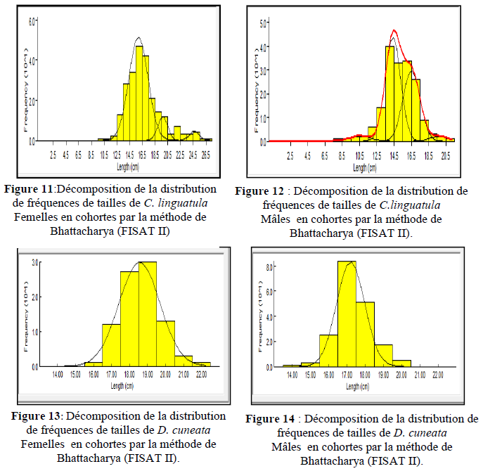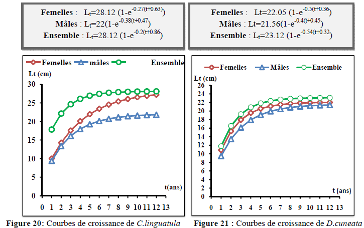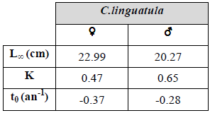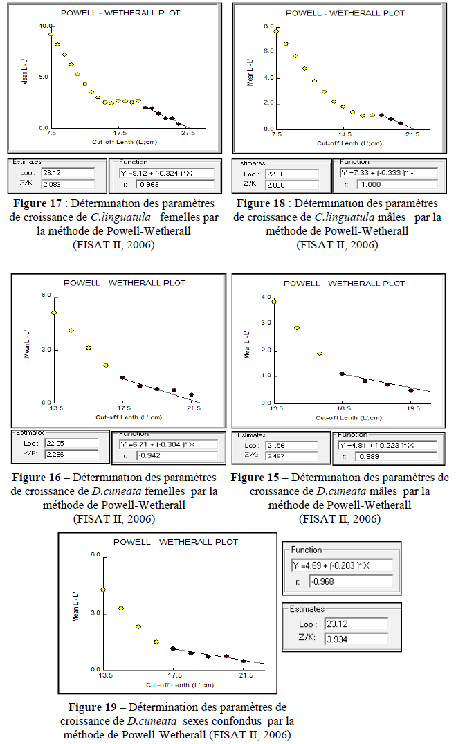Chez C.linguatula la valeur de la longueur asymptotique obtenue pour les deux sexes par la méthode de Powell-Wetherall (1986) (Femelles et ensemble : 28.12 cm, mâles : 22 cm) est supérieure à la taille maximale observée. Il en est de même pour D.cuneata où les valeurs de L∞ sont de 22.05 cm chez les Femelles, 21.56 cm chez les mâles et 23.12 cm à sexes confondus. Chez les deux espèces la valeur de L∞ rejoint l’approximation de Pauly (1985).