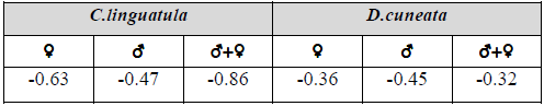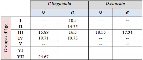 Pour D.cuneata, nous n’avons obtenu qu’un seul groupe d’âge avec une taille moyenne de 18.55 cm chez les femelles et 17.21cm pour les mâles. Rousset et Marinaro (1983) ont obtenu Cinq groupes d’âge, cette différence est due à l’échantillonnage. Pour cette raison nous n’avons pas pu attribuer une longévité pour cette espèce.