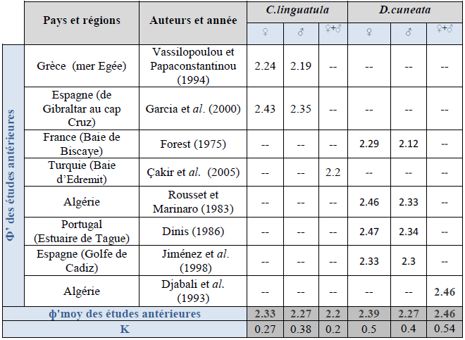 Tableau 8 : Vitesse de croissance moyenne et coefficient de croissance des espèces C.linguatula et D.cuneata d’après la bibliographie.