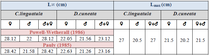 Chez C.linguatula la valeur de la longueur asymptotique obtenue pour les deux sexes par la méthode de Powell-Wetherall (1986) (Femelles et ensemble : 28.12 cm, mâles : 22 cm) est supérieure à la taille maximale observée. Il en est de même pour D.cuneata où les valeurs de L∞ sont de 22.05 cm chez les Femelles, 21.56 cm chez les mâles et 23.12 cm à sexes confondus. Chez les deux espèces la valeur de L∞ rejoint l’approximation de Pauly (1985).